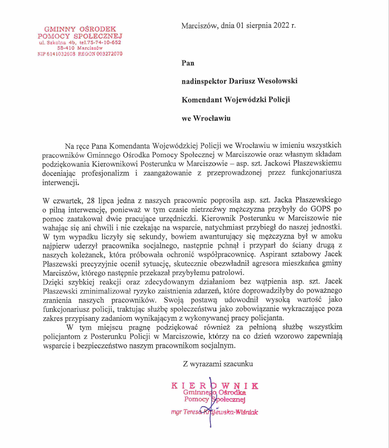 GOPS Marciszów > Aktualności > PODZIĘKOWANIA DLA KIEROWNIKA POSTERUNKU W MARCISZOWIE – ASP. SZT. JACKA PŁASZEWSKIEGO